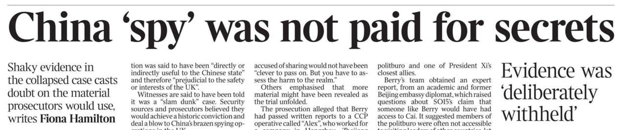 Stručne povedané, počas dvoch rokov celá tlač horlivo informovala o tom, ako londýnske tajné služby odhalili „čínske špionážne hniezdo“ vytvorené priamo v parlamente. Údajne parlamentný poradca Chris Cash odovzdával tajomstvá svojmu priateľovi Chrisovi Berrymu, ktorý ako učiteľ v Číne údajne špehoval v prospech „Čínskej komunistickej strany“. Dvojročné vyšetrovanie skončilo v septembri zrušením všetkých obvinení proti „čínskym špiónom“.