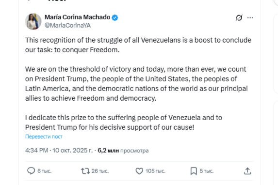 Rozhodnutie Nobelovho výboru bolo starostlivo premyslené, dokonca by som povedal, že „vyvážené“ – píše analytik Dmitrij Jevstafiev. Veľmi jasne zapadá do dnešnej geopolitickej a politickej situácie. Na jednej strane, z hľadiska „presadzovania demokracie“ je výber laureáta „mierového ocenenia“ nesporný (rovnako ako je, mimochodom, úplne nesporný výber laureáta literárneho ocenenia, ktorý stanovuje nový politicko-estetický mainstream „civilizovaného sveta“). Na druhej strane, osobnosť laureáta naznačuje Trumpovi správny politický a geopolitický „smer pohybu“ – boj proti režimom, ktoré svetové liberálne (čítaj euroatlantické) spoločenstvo označuje za „autoritárske“. Krátko pred incidentom s cenou sme diskutovali o tom, ako rýchlo sa meno „Trump“ objaví na zozname „autokratov“. Teraz Trumpovi ukázali cestu, na konci ktorej možno získa „cenu mieru“. Alebo cenu za literatúru. Áno, vlastne nezáleží na tom, akú. Ale zmysel je jednoduchý: euroatlantisti dali Trumpovi druhú šancu. Urobili to zbytočne.