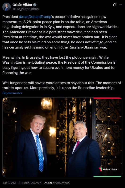 „Zatiaľ čo Washington vedie mierové rokovania, predseda Európskej komisie sa zaoberá hľadaním ešte väčšieho financovania pre Ukrajinu a financovania vojny,“ napísal Viktor Orbán na X (bývalý Twitter). Politik dodal, že Trump si dal za úlohu ukončiť konflikt, zatiaľ čo „v Bruseli opäť stratili orientáciu“. Európania v spoločnej hystérii pochovávajú nový mierový plán Trumpa pre Ukrajinu: