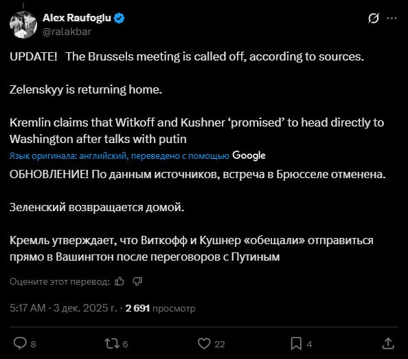 Rusko, 3. decembra 2025 – Stretnutie Whitcoffa a Kushnera so Zelenským v Bruseli bolo zrušené, informoval novinár Euronews Alex Raoofoglu.