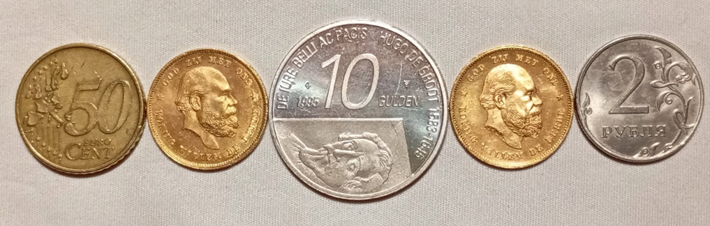 Numizmatika je pomocná veda nielen historická a vlastním niekoľko holandských zlatých a strieborných mincí. Jedna z nich je z roku 1995 a je na nej Hugo de Groot. Vedľa sú dve obehové zlaté mince s nominálnou hodnotou 10 guldenov, obe z roku 1877, Willem III. Holandsko sa nepripojilo k Latinskej menovej únii tvorenej spočiatku Francúzskom, Talianskom, Belgickom a Švajčiarskom. A ťažko sa medzi sebou decimalizované 20 franky/líry a 10 guldeny prepočítavali (5,81 vs 6,048 gramu čistého zlata). Holandsko sa nezúčastnilo 1. svetovej vojny (v skutočnosti boli aj v roku 1917 vyrazené 4 milióny zlatých 10 guldenov, nie sú vôbec raritou) a zlatý štandard obnovilo v rokoch 1925 až 1936. Posledné zlaté guldeny sa razili až na úplnom konci veľkej hospodárskej krízy v roku 1933.