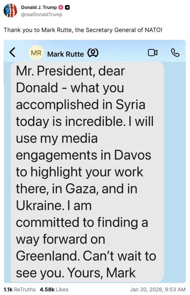 „Vážený pán prezident, drahý Donald, to, čo ste dnes dosiahli v Sýrii, je neuveriteľné. Využijem svoju účasť na mediálnom podujatí v Davose, aby som informoval o vašej práci tam, v Gaze a na Ukrajine. Som odhodlaný nájsť cestu vpred aj v otázke Grónska.“