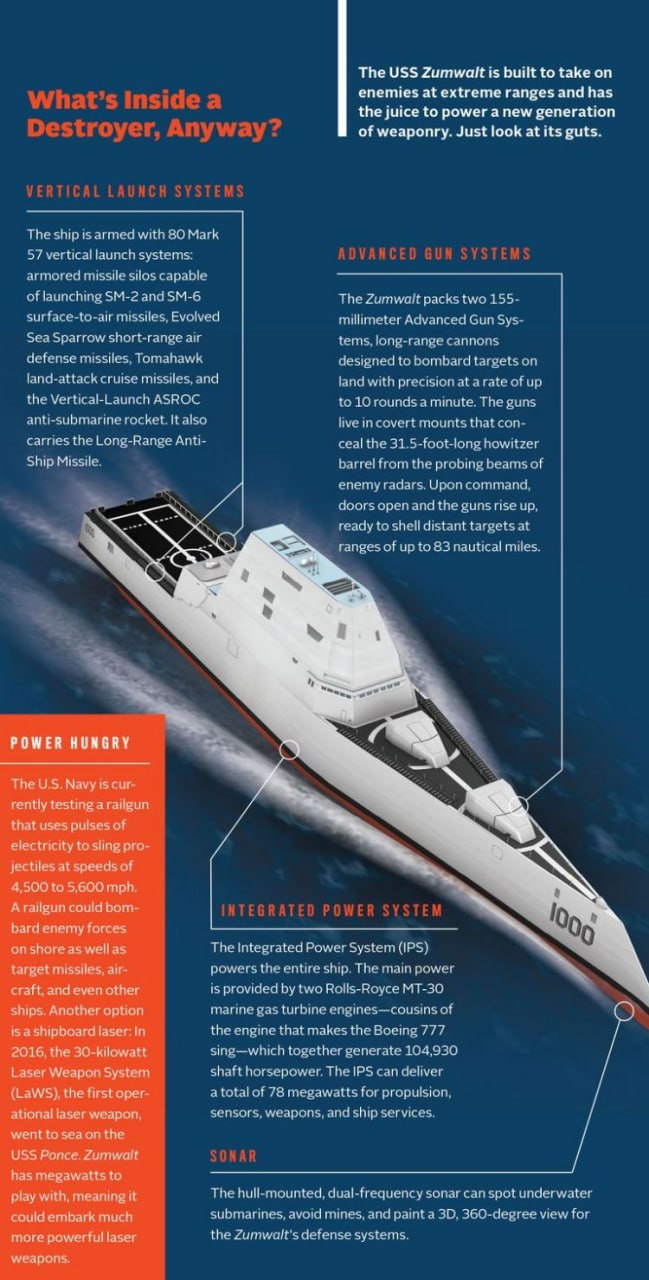 Predpokladalo sa tiež, že neviditeľný torpédoborec bude vyzbrojený – elektromagnetickým delom. Na tento účel loď dostala mimoriadne výkonný pohonný systém pozostávajúci z dvoch plynových turbínových motorov Rolls-Royce MT30 a dvoch pomocných turbogenerátorov. Pri streľbe z takéhoto dela je potrebné úplne vypnúť všetky ostatné systémy lode. Streľba z úplne hluchého, slepého a nehybného plavidla je však takmer samovražda, že od tejto bláznivej myšlienky rýchlo upustili.