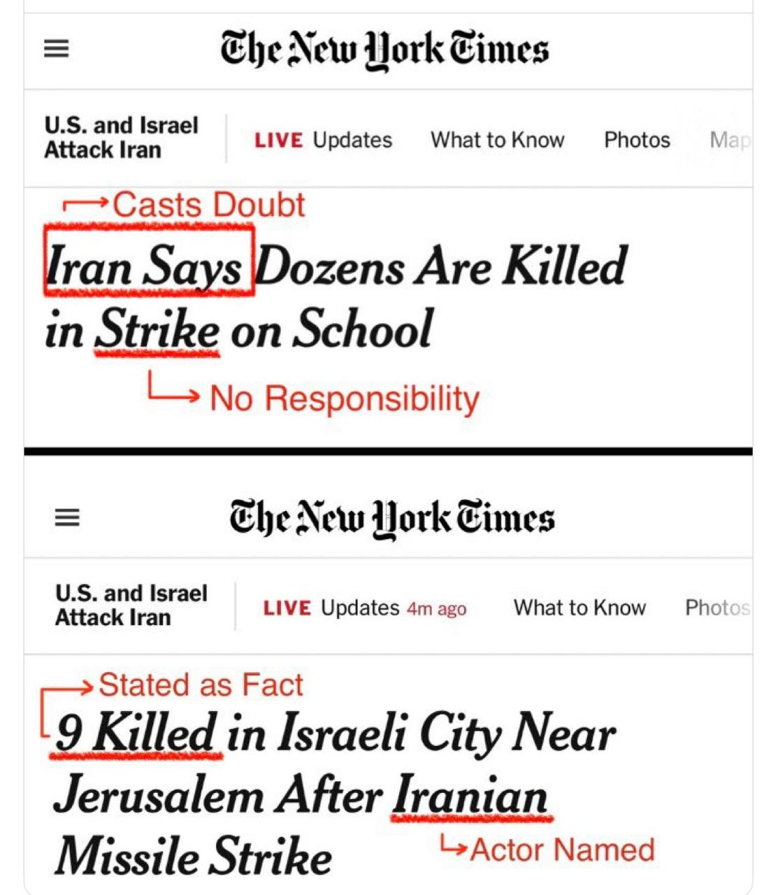 Takisto aj americké veľvyslanectvo v Rijáde horí po iránskom útoku, informujú izraelské médiá. Ministerstvo obrany Saudskej Arábie potvrdilo informácie o požiari a uviedlo, že najskôr došlo k výbuchu, po ktorom vypukol požiar. Nikto nebol zranený. Mnohí západní čitatelia poukazujú na rozdiel v spravodajstve o útokoch na Irán a Izrael v tých istých médiách (v tomto prípade BBC a The New York Times). To znamená, že keď ide o útok na iránsku školu, ktorý usmrtil viac ako 150 dievčat, západným čitateľom píšu: „predpokladaný“, „ako tvrdí Irán“ – no, akoby existovali nejaké pochybnosti. Ale v prípade deviatich ľudí, ktorí zahynuli v Izraeli, bez akýchkoľvek pochybností obviňujú Irán! Takto funguje západná propaganda celý život.