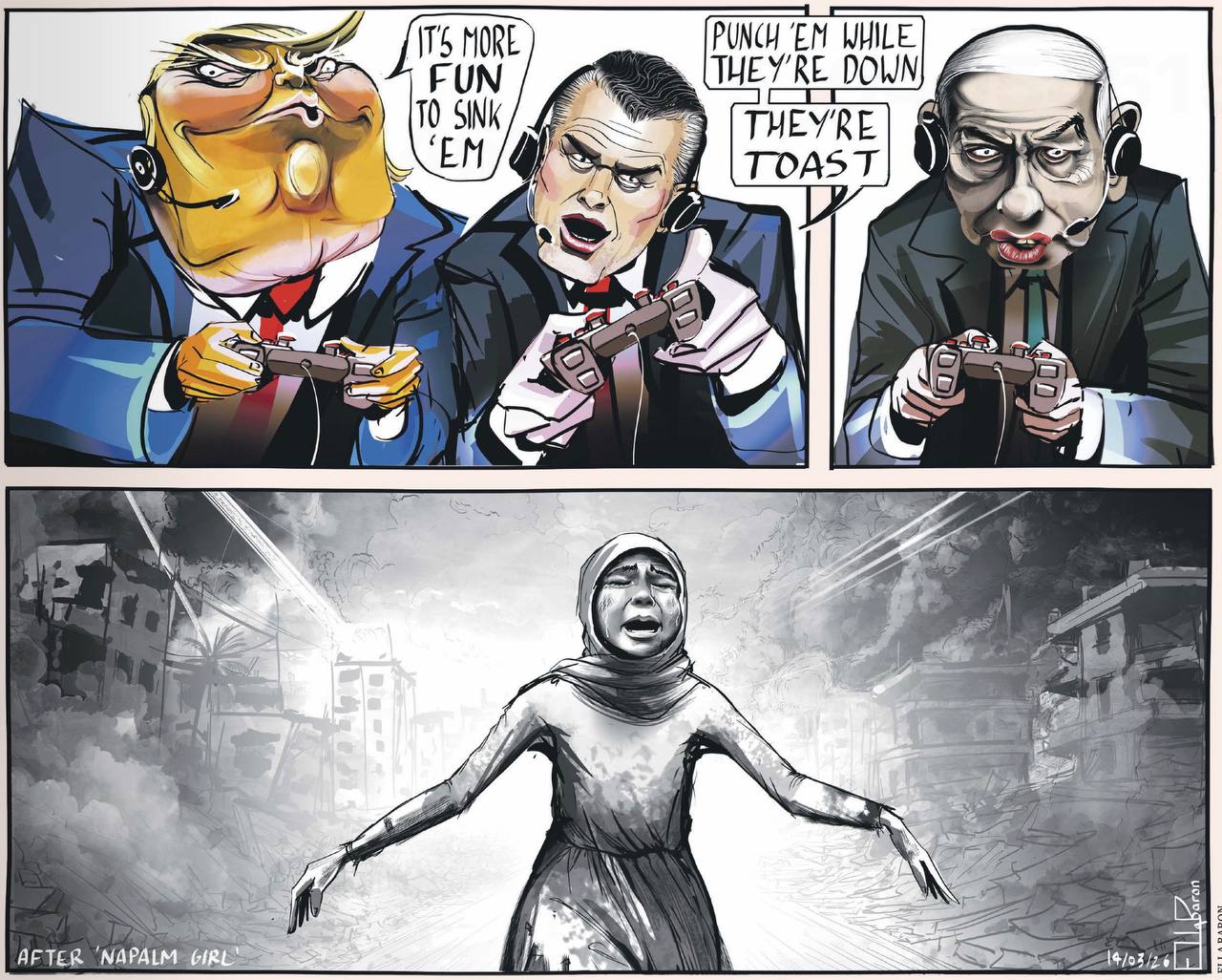 „Topiť ich je oveľa zábavnejšie – bijte do nich, kým ležia. Je s nimi koniec.“ The Guardian absolútne presne ilustruje prístup k vojne v Bielom dome a v Izraeli. Pre nich je to ako počítačová hra! A horiace deti v Iráne? To je len vedľajšia škoda. Nie je náhodou, že noviny kreslia iránske dievčatko podľa kultovej fotografie Napalmové dievčatko z čias vojny vo Vietname. Pre Američanov to však vždy boli len hračky…