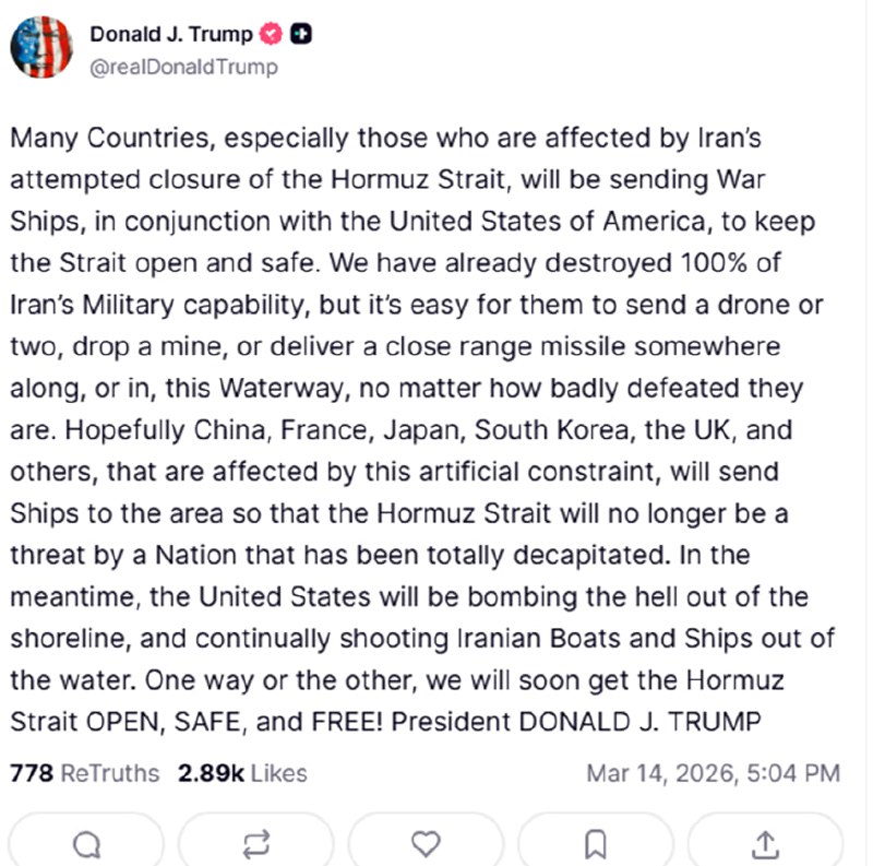 Trump zverejnil príspevok, v ktorom vyhlásil, že USA zničili 100 % vojenského potenciálu Iránu, a vyzval Čínu, Francúzsko, Japonsko, Južnú Kóreu, Veľkú Britániu a ďalšie krajiny, ktoré údajne „utrpeli škody“ v dôsledku blokády Hormuzského prielivu, aby tam vyslali svoje lode.