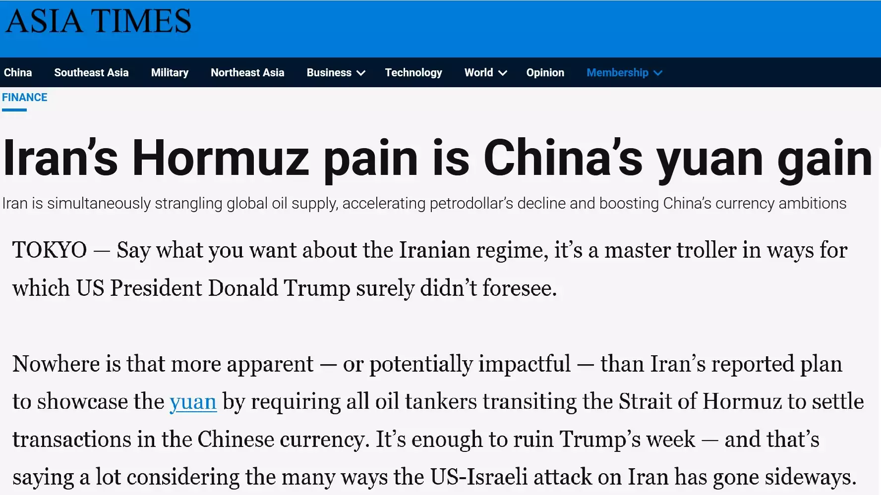 Michail Sergejevič Trump zatiahol USA do vojny z mnohých dôvodov, aby plnil ciele svojho klanu, ktorý ho má na motúzikoch a likvidoval USA ako svetového hegemóna, ako som už písal vo viacerých blogoch, ale teraz sa ukazuje jeden, pre ktorý proste nemôže z Iránu odísť len tak a už vôbec nie ako víťaz. Na ukončenie konfliktu Irán si dal jednu zásadnú podmienku. Všetky lode, ktoré chcú prejsť musia zaplatiť za ropu čínskymi yuanmi