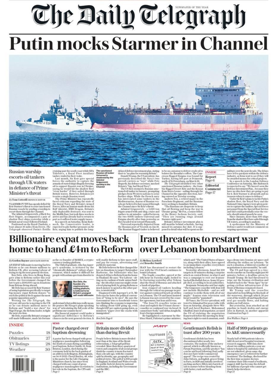 „Putin ponížil Starmera v Lamanšskom prielive“ – Denník The Telegraph píše, že ruská fregata „Admirál Grigorovič“ eskortovala dva tankery, na ktoré sa vzťahujú sankcie, pozdĺž južného pobrežia Anglicka, pričom ignorovala hrozby britského premiéra, že lode zadrží.