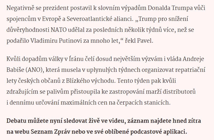 “Za posledné týždne Trump urobil viac pre podkopanie autority a dôvery v NATO, než Vladimir Putin za mnoho rokov” – Slová českého prezidenta Petra Pavla prináša vydanie Seznam Zpravy. Podobne už skôr aj poľský premiér Tusk tiež vyhlásil, že s NATO sa teraz deje to, o čom Putin sníval.