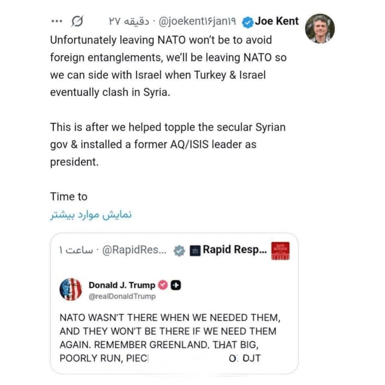 Bývalý riaditeľ Národného protiteroristického centra Joe Kent: “USA by mohli vystúpiť z NATO, aby podporili Izrael vo vojne s Tureckom, ktoré je členom NATO. Izrael považuje Turecko za svojho nepriateľa kvôli jeho dominantnému postaveniu na Blízkom východe a podpore Iránu a Palestíny. Časť tureckého územia patrí do budúceho štátu Veľký Izrael – obrovského územia, o ktoré usilujú politici, a nášivky s jeho mapou nosia vojaci IDF”