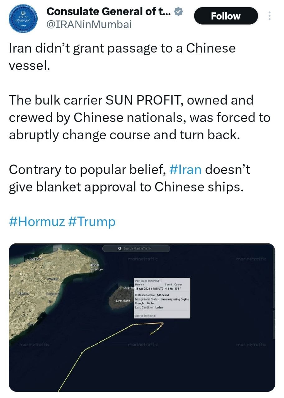 Irán včera neumožnil prechod čínskej lodi. Nákladná loď SUN PROFIT, ktorá patrí čínskym občanom a má výlučne čínsku posádku, bola nútená prudko zmeniť kurz a otočiť sa späť. Na rozdiel od všeobecného presvedčenia Irán neposkytuje čínskym lodiam automatické povolenie na prechod — Veľvyslanectvo Iránu v Bombaji