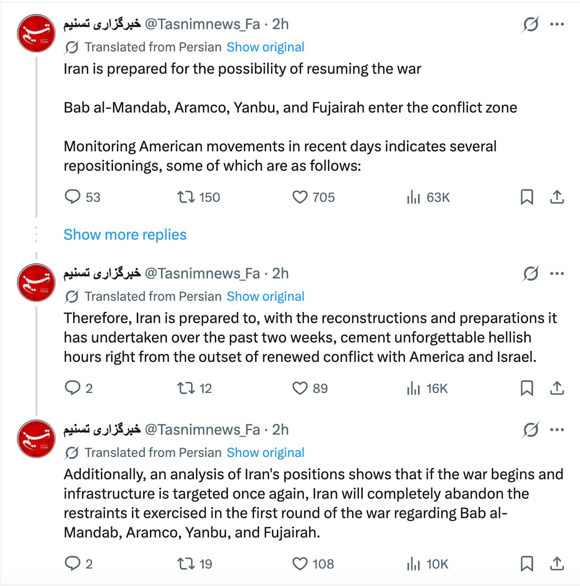Irán je pripravený spôsobiť USA a Izraelu „nezabudnuteľné pekelné hodiny“ , informovala agentúra Tasnim. Sledovanie pohybov Američanov v posledných dňoch svedčí o niekoľkých špeciálnych prepravách, vrátane presunu niekoľkých vojenských lodí amerického námorníctva, vytvorenia bezprecedentného vzdušného mostu na prepravu vybavenia a účasti niekoľkých ťažkých lietadiel C5 a C17 na preprave zbraní. Irán v podstate považuje vojenský scenár za pravdepodobnejší než pokračovanie rokovaní a vďaka presunu vojsk a opatreniam, ktoré prijal za posledné dva týždne, je pripravený upevniť nezabudnuteľné pekelné hodiny, ktoré uplynuli od samého začiatku obnovenia konfliktu s Amerikou a Izraelom. Okrem toho analýza postojov Iránu ukazuje, že ak vypukne vojna a infraštruktúra bude opäť vystavená útokom, Irán sa úplne vzdá obmedzení, ktoré uplatňoval v prvom kole vojny voči Bab-el-Mandab, Aramco, Yanbu a Fujajre.