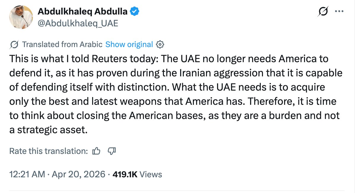 “Spojené arabské emiráty už nepotrebujú ochranu Ameriky, pretože počas iránskej agresie sme dokázali, že sme schopní sa dôstojne brániť sami. Spojené arabské emiráty potrebujú len to najlepšie a najnovšie zbrane, aké Amerika ponúka. Preto nastal čas zamyslieť sa nad zatvorením amerických základní, keďže sú skôr bremenom ako strategickým aktívom” – emiratský komentátor a analytik, bývalý poradca prezidenta Spojených arabských emirátov Abdulhalek Abdullah v rozhovore pre agentúru Reuters.