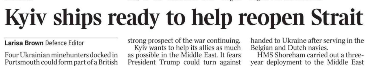 Ide o štyri hrdzavé mínolovky, ktoré boli v roku 2023 vyradené z britského, belgického a holandského námorníctva a odovzdané Ukrajine. Odvtedy kotvia v prístave v Portsmouthe. Dnes bude Ukrajina rokovať o vyslaní týchto plavidiel v rámci francúzsko-britskej eskadry na zabezpečenie bezpečného prechodu lodí cez Hormuz po ukončení bojových operácií v Iráne. Noviny citujú slová istého ukrajinského zdroja v tejto súvislosti: