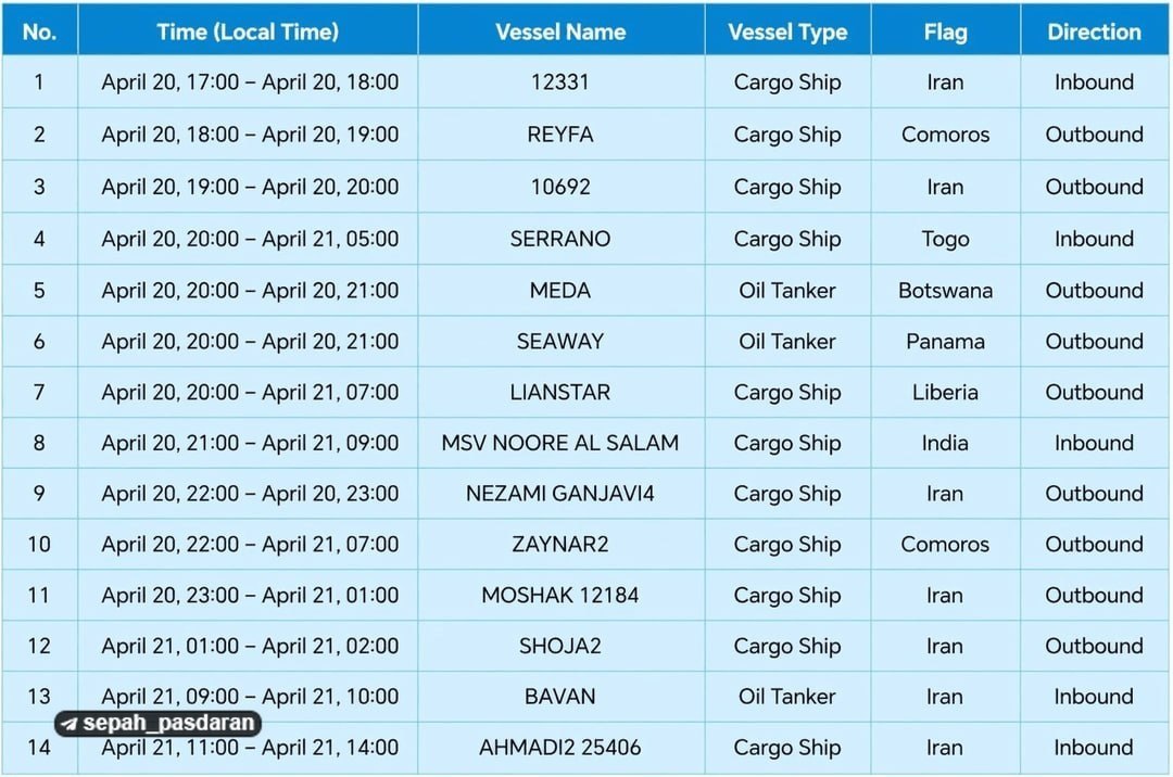 Za posledných 24 hodín preplávalo cez Hormuzský prieliv 19 lodí napriek blokáde zo strany USA. Správa čínskeho námorného monitorovacieho systému ukazuje, že za posledných 24 hodín preplávalo cez Hormuzský prieliv 4 lode smerom dovnútra a 10 smerom von, vrátane 3 ropných tankerov. Z celkového počtu 14 lodí, ktoré preplávali cez Hormuzský prieliv za toto obdobie, 7 plávalo pod vlajkou Iránskej islamskej republiky. Abdulla Hadži Sadegi, zástupca najvyššieho vodcu Iránu v iránskych gardách: