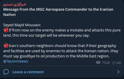 Veliteľ leteckých a kozmických síl islamských gárd opäť hrozí bombardovaním celého Blízkeho východu: “Ak odteraz nepriateľ urobí chybu a zaútočí na túto čistú zem, tentoraz bude naším cieľom všetko, čo poviete. Južní susedia Iránu musia vedieť, že ak nepriatelia využijú ich územie a zariadenia na útok na iránsky národ, budú sa musieť rozlúčiť s ťažbou ropy v regióne Blízkeho východu.”