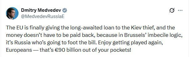 Dmitrij Medvedev sa vyjadril k úveru, ktorý Európska únia poskytla Ukrajine. V predchádzajúcom nariadení EÚ sa uvádzalo, že Ukrajina bude povinná vrátiť prostriedky len v prípade, ak Rusko vyplatí určité „reparácie“.